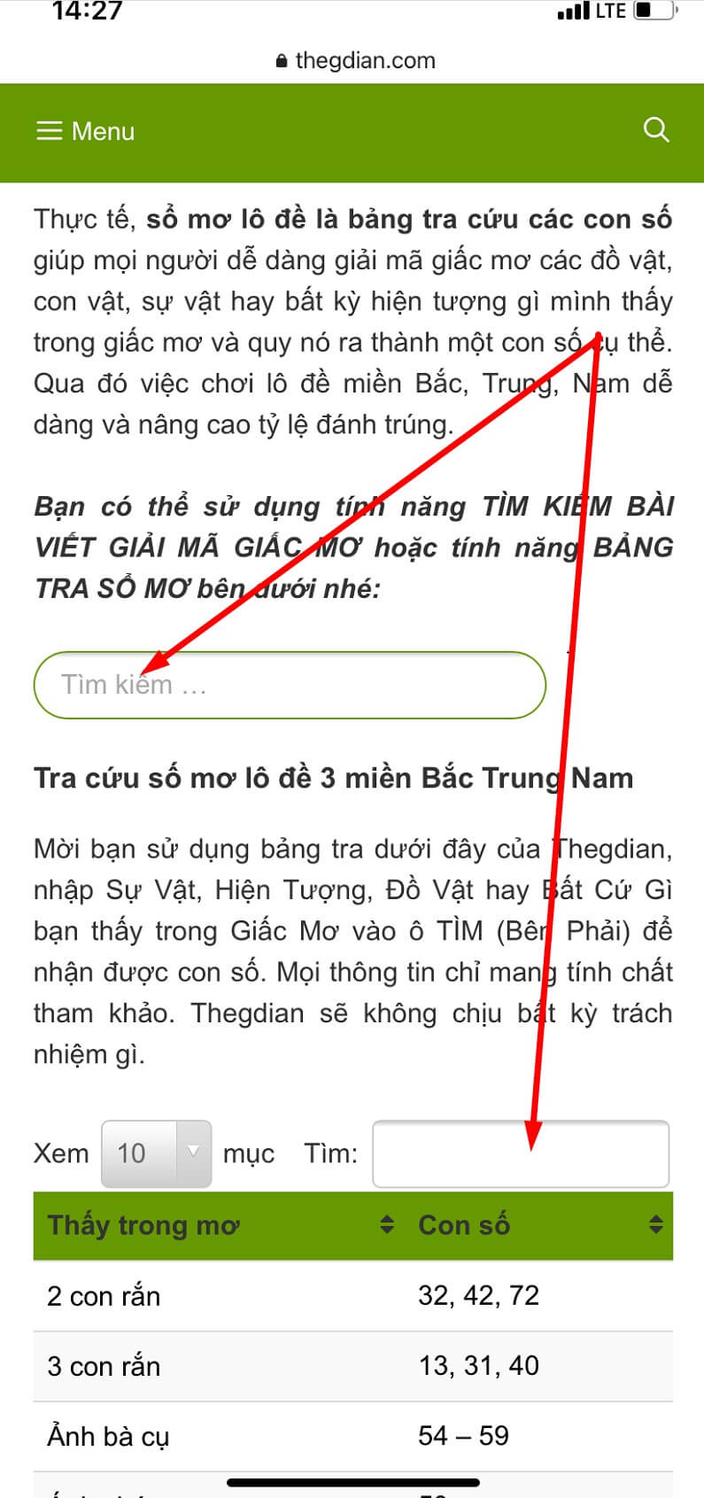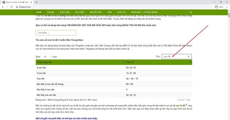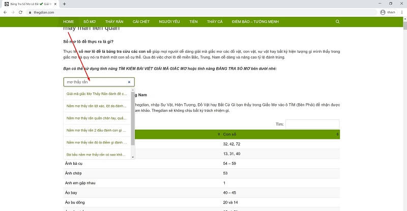 Còn nếu bạn chỉ muốn xem con số thì dùng tính năng thứ 2 ở vị trí dưới hình, như ví dụ mình nhập “con rắn” là thứ mình thấy trong giấc mơ thì hệ thống sẽ đề xuất cho bạn các con số lô đề.